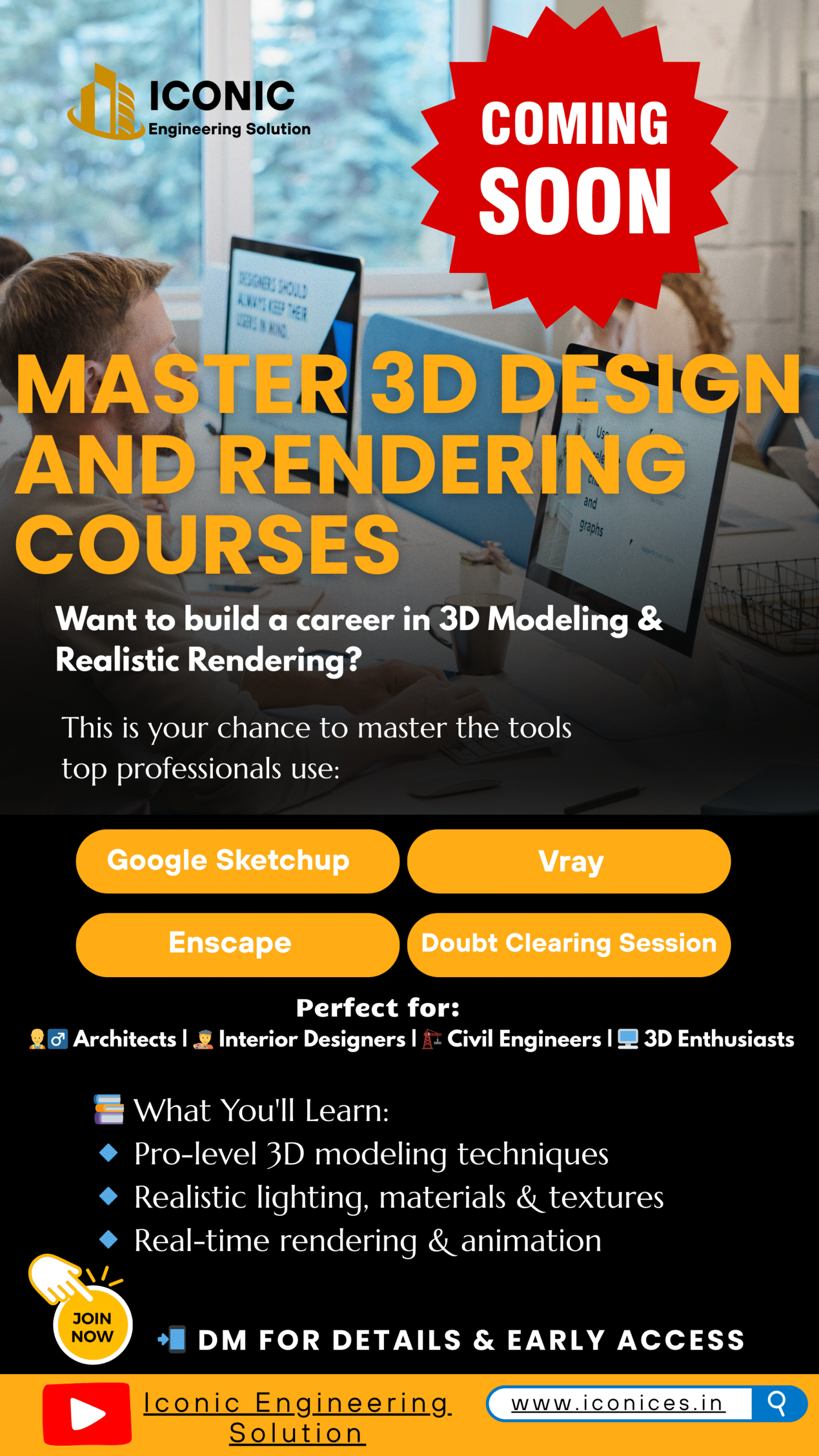 Master 3d Design & Rendering CourseMaster 3d Design & Rendering CourseSeptember 18, 2025Com 0 Tags: autocadautocad courseautocad course in hindienscape for sketchuponline software classessketchupsketchup coursevrayvray rederingShare on: MASTER STUDY IN 3D MODELING AND RENDERING